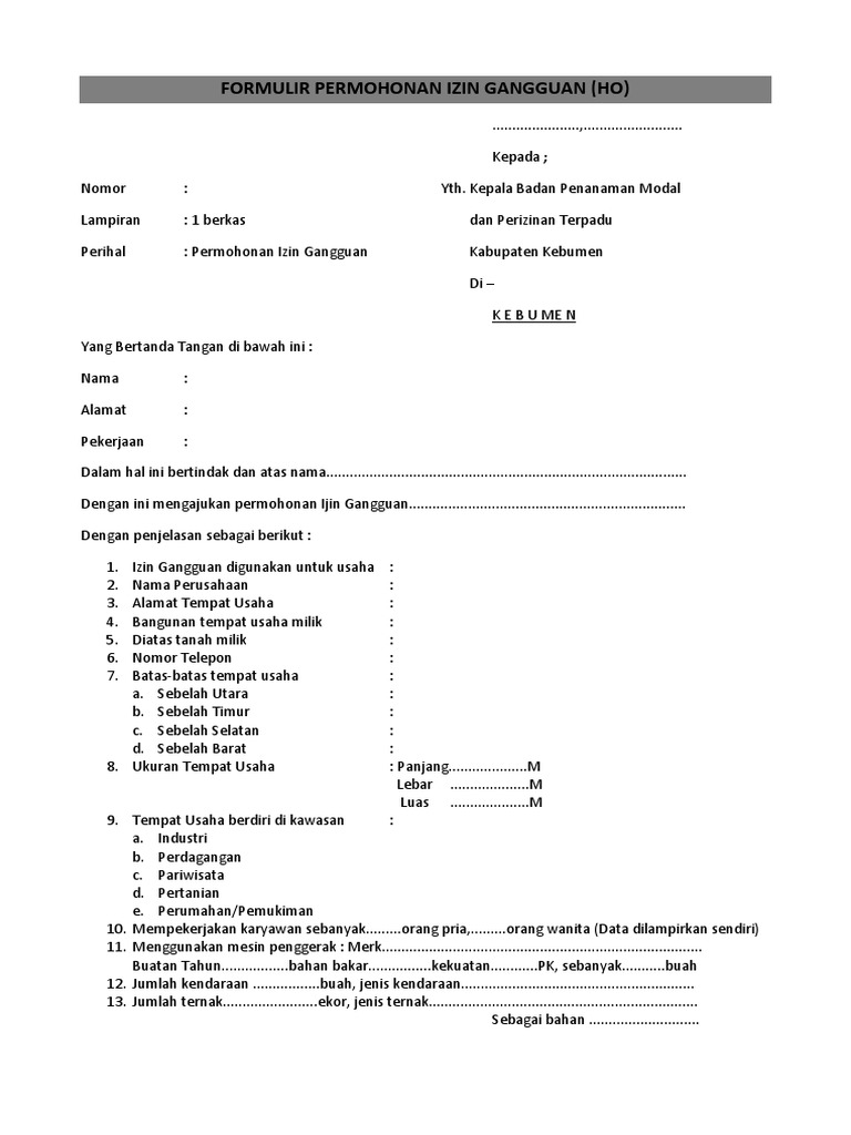 Contoh Surat Izin Gangguan Pdf - Contoh Situ Surat Izin Tempat Usaha En5k69pvwkno - • • sebelum membuat surat jangan lupa meminta nomor surat pada sekcam lampiran lebi$ dari !. Contoh surat ho / izin gangguan. Saat ini surat izin gangguan di keluarkan oleh dinas perizinan domisili usaha di daerah tingkat ii atau setingkat kabupaten dan kotamadya. Baik itu surat yang dipergunakan oleh perusahaan, instansi pemerintahan, lembaga, organisasi, dan perseorangan. Salah satu contoh yang paling sering digunakan adalah surat permohonan izin kerja. Surat izin adalah salah satu surat yang digunakan untuk permohonan kegiatan ataupun yang lainnya dan juga untuk tidak ikut dalam sebuah acara surat ini sebenarnya hampir sama dengan surat permohanan karena isinya untuk memohon izin untuk mengajukan sebuah acara maupun tidak ikut.