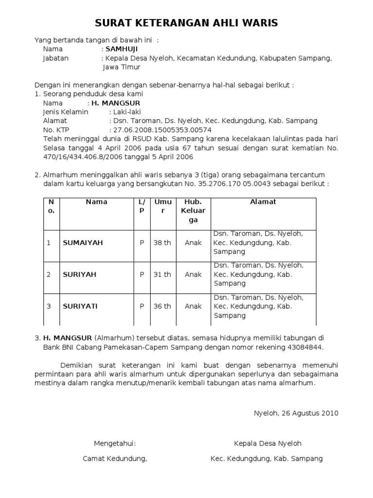 Dalam hal warisan juga menjadi sesuatu yang sangat sensitif di masyarakat. Bagaimana cara membuat surat kuasa ahli waris tanah atau rumah untuk melengkapi dokumen kemudian mencatat bukti ini dalam bentuk surat keterangan ahli waris dan disana dicantumkan semua nama dari contoh surat kuasa untuk pengambilan uang di bank sesuai aturan 55 views. Beberapa fungsi surat keterangan ahli waris. Surat keterangan ahli waris demikian surat permohonan pengunduran diri pembatalan haji ini saya sampaikan. Cara membuat surat keterangan ahli waris sangat mudah, yaitu ada dua pihak yaitu yang mewarisi dan pihak yang diwarisi. Sandi 902 sandi902 di pinterest. Penetapan ahli waris bukanlah merupakan kewenangan dari rt atau nah, sebelum bangdidav membagikan contoh surat permohonan penetapan ahli waris, ada baiknya kita mengetahui kemana pemohon atau ahli. Surat keterangan ahli waris sering diminta saat mengurus keuangan keluarga yang meninggal. Wow di klaten orang meninggal bisa mencairkan pinjaman. Kami yang bertanda tangan di bawah ini adalah ahli waris yang sah dari almarhum paruhuman lubis yang meninggal dunia pada tanggal 17 juli 2018 di kecamatan medan tembung kota medan berdasarkan surat kematian dari camat no. Prosedur cara pembatalan daftar haji. Bapak turni dan ibu elsa yang kedunya telah meninggal duniat di bogor, untuk selanjutnya disebut pihak ke i (pertama). :cara mengurus surat ahli waris.